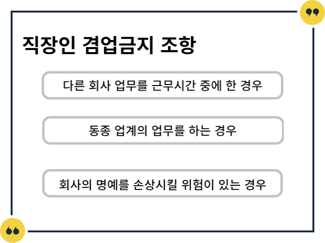 근로계약서에 명시한대로 직장인 근로자는 일정한 시간만큼 직장에서 업무를 수행해야하는데요. 다른 회사 업무를 근무시간에 수행한 경우나 부업의 여파로 근무시간을 제대로 지키지 않는 경우 근로계약 위반이나 근무태만을 요건으로 징계를 받을 수도 있습니다. 또 동종 업계의 업무를 하는 경우에는 회사의 이익에 직접/간접적으로 피해를 입혔다고 해석할 가능성도 있습니다. 회사의 명예를 실추시킬 수 있다고 판단될 경우에도 문제재기를 할 수 있습니다.