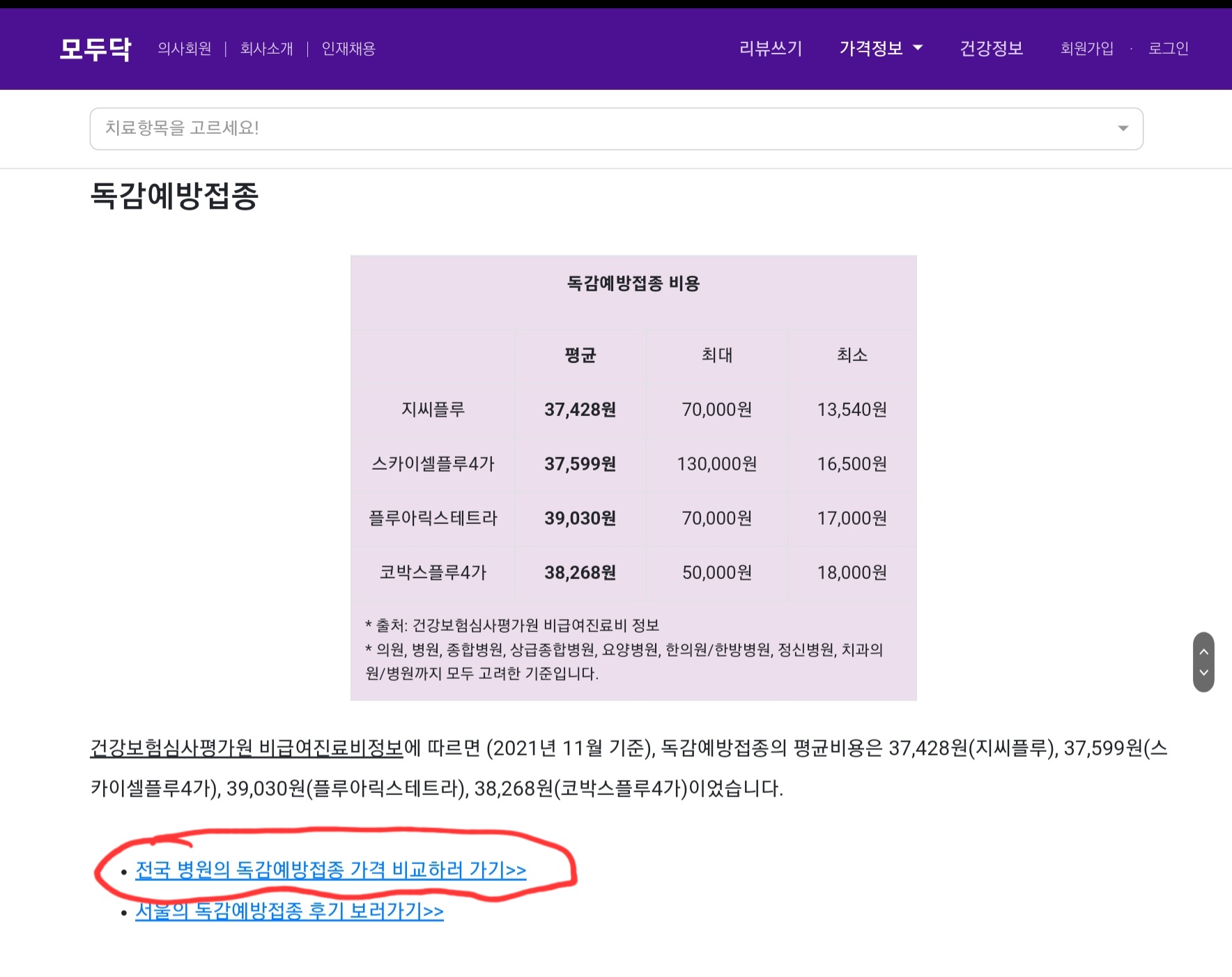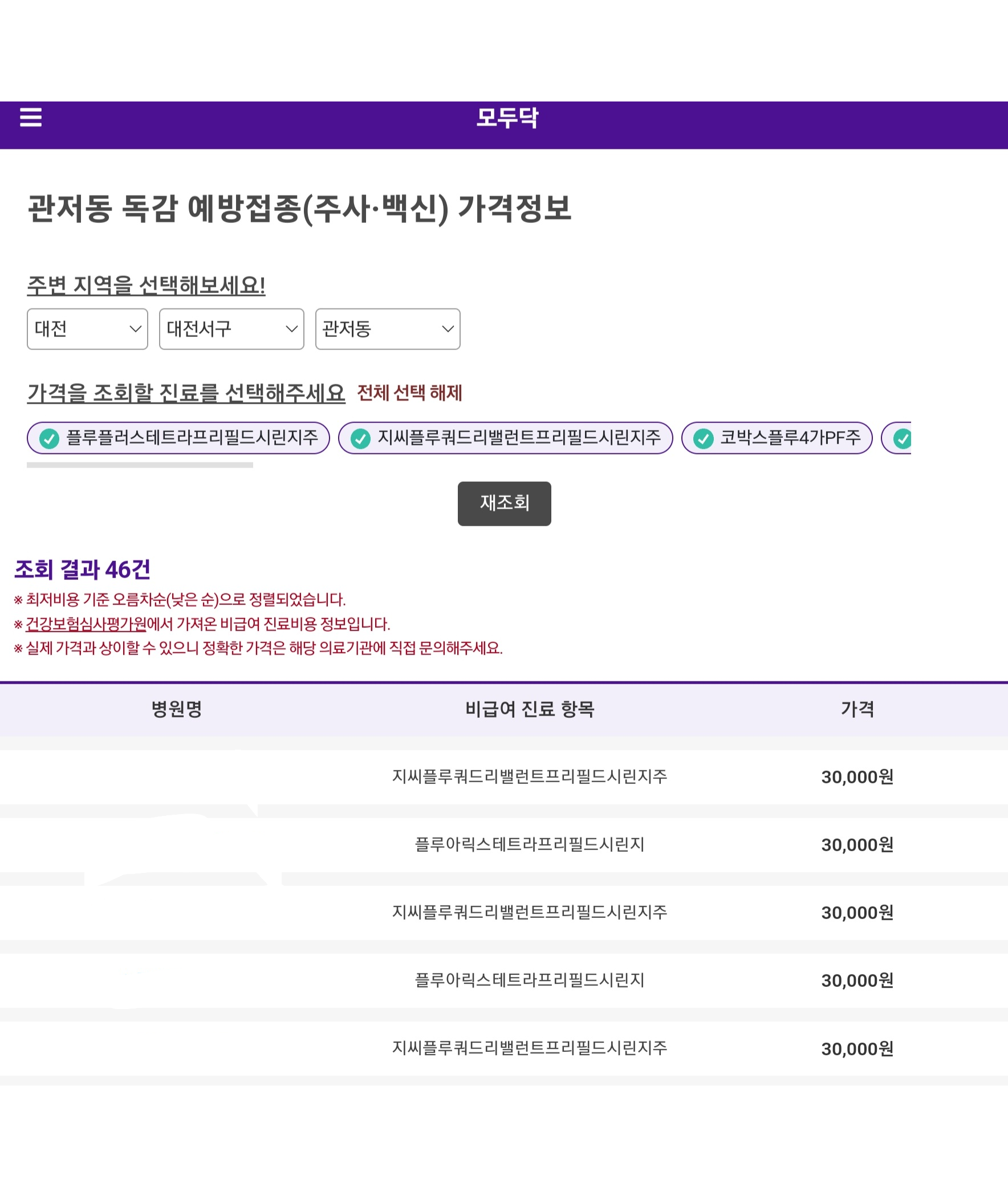 2) 유료독감예방접종 가격 조회 : 모두닥 홈페이지