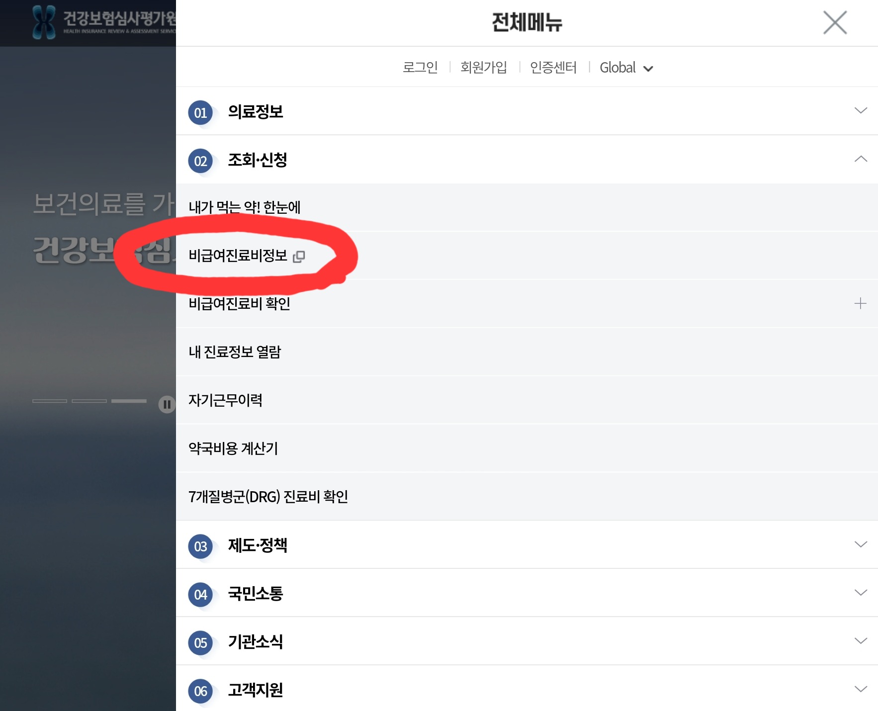 건강보험심사평가원 홈페이지 우측 상단의 메뉴 버튼을 클릭한 후 "02. 조회•신청 > 비급여진료비정보"를 클릭합니다.