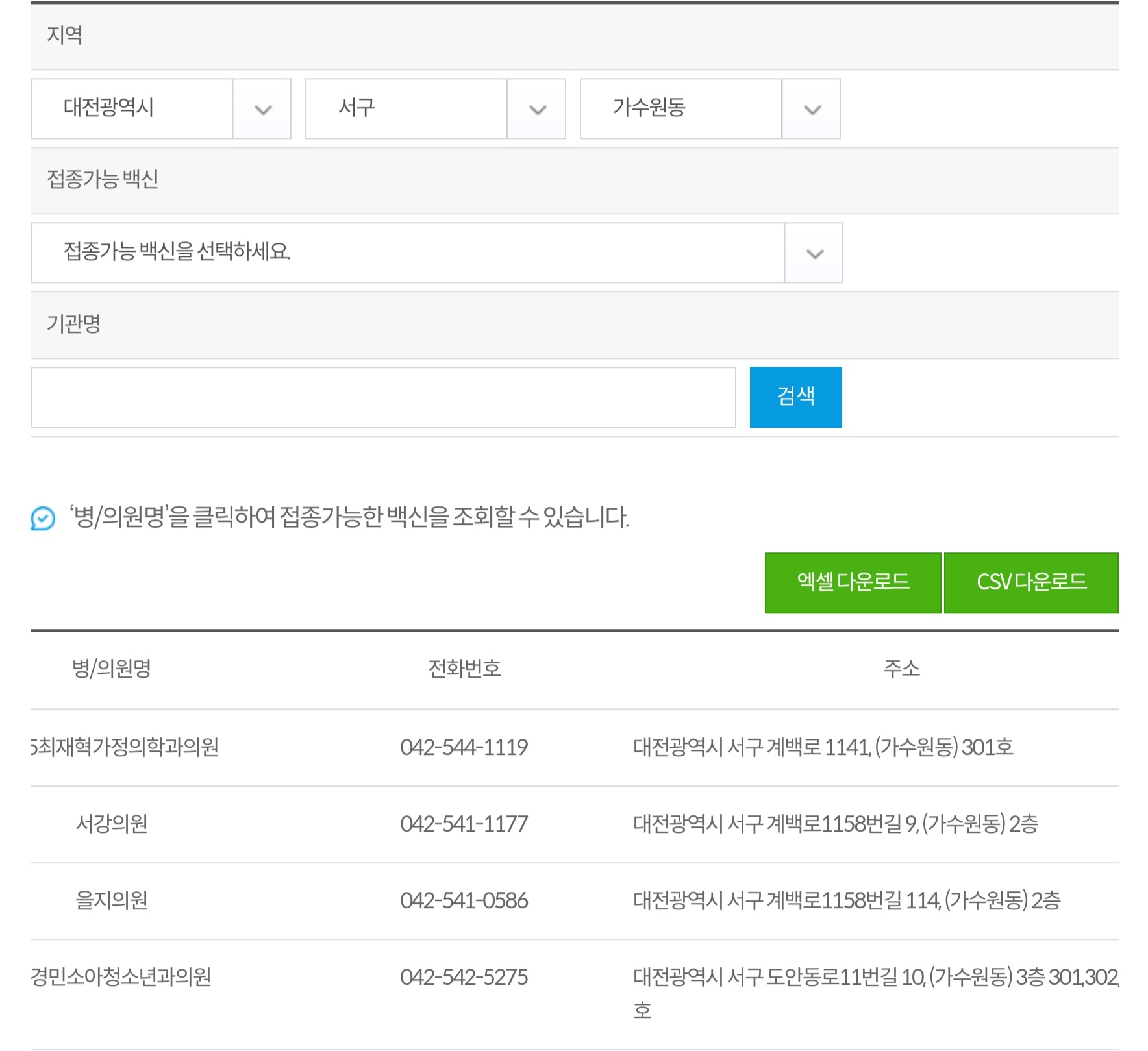 동에대한 정보가 없어 좀 광범위하게 검색되는데요. 다음 페이지에서 동을 선택해준 후 검색하면 국가지원사업인 무료독감예방접종이 가능한 병원에 대한 정보가 나옵니다. 미리 전화로 잔여 백신이 있는지 확인하고 예약 후 방문하시는 것이 좋습니다.