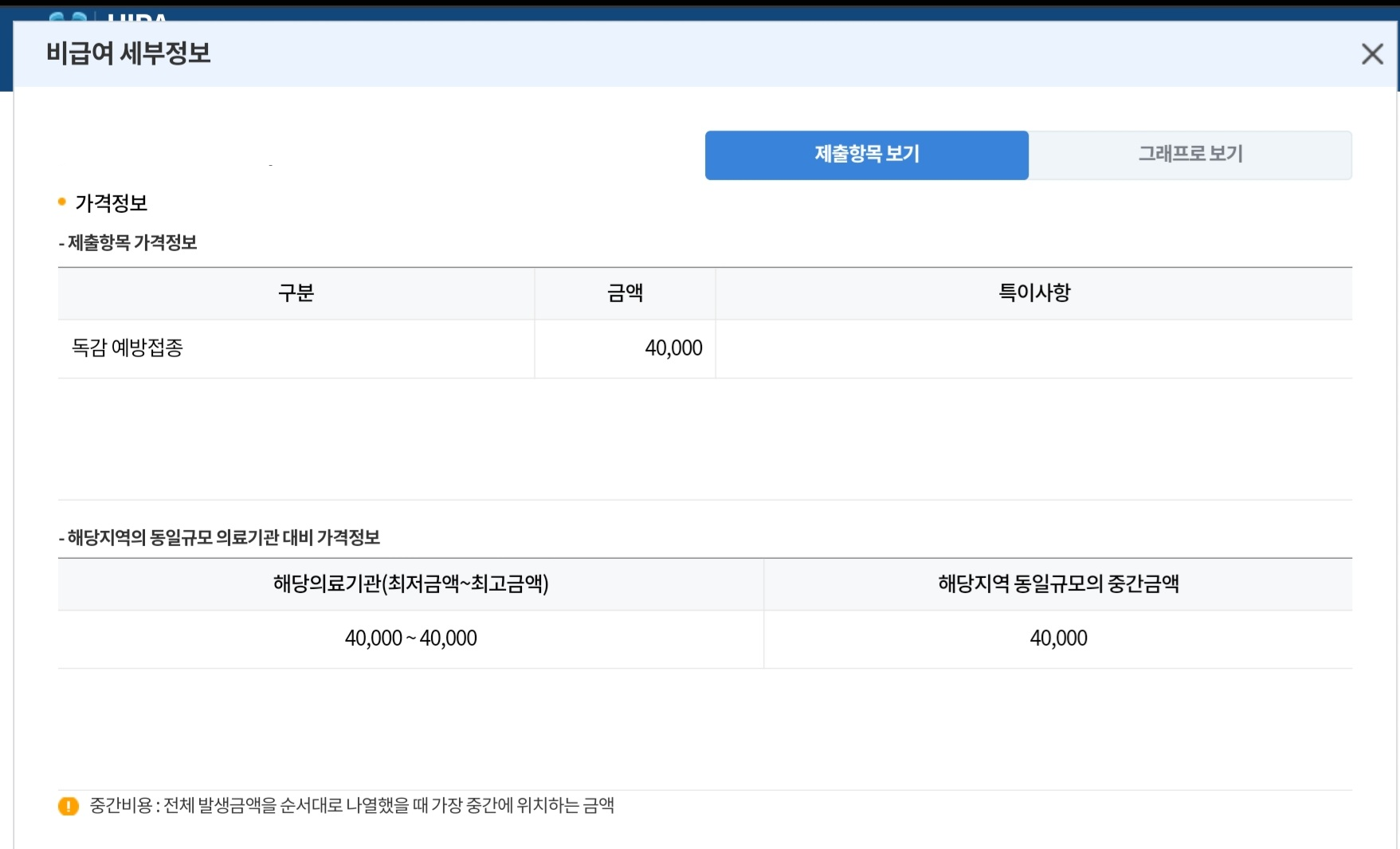 1) 유료독감예방접종 가격 조회 : 건강보험심사평가원 홈페이지