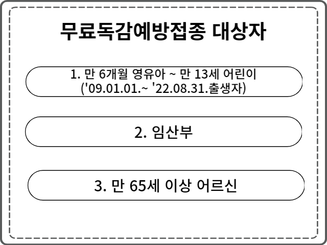 무료독감예방접종 지원 사업의 대상자는 영유아, 어린이, 임산부, 어르신이 대상이 됩니다. 영유아, 어린이, 어르신의 경우 나이로 무료독감예방접종의 지원 대상을 나누게되는데요. 만 6개월 이상의 영유아에서부터 만 13세의 어린이('09.01.01.~ '22.08.31.출생자까지), 만 65세 이상의 어르신, 임산부가 무료독감예방접종의 대상자로 분류되니 무료독감예방접종 대상자인지 확인해보신 후 무료독감예방잡종의 혜택을 꼭 누리시길 바랍니다. 독감이 유행되기 전에 독감예방접종을 받아 항체를 생성해두는 것도 중요하지만 독감 백신의 수급 문제로 못받게 될 수도 있으니 서둘러 무료독감예방접종을 받으시는 것을 추천드립니다.