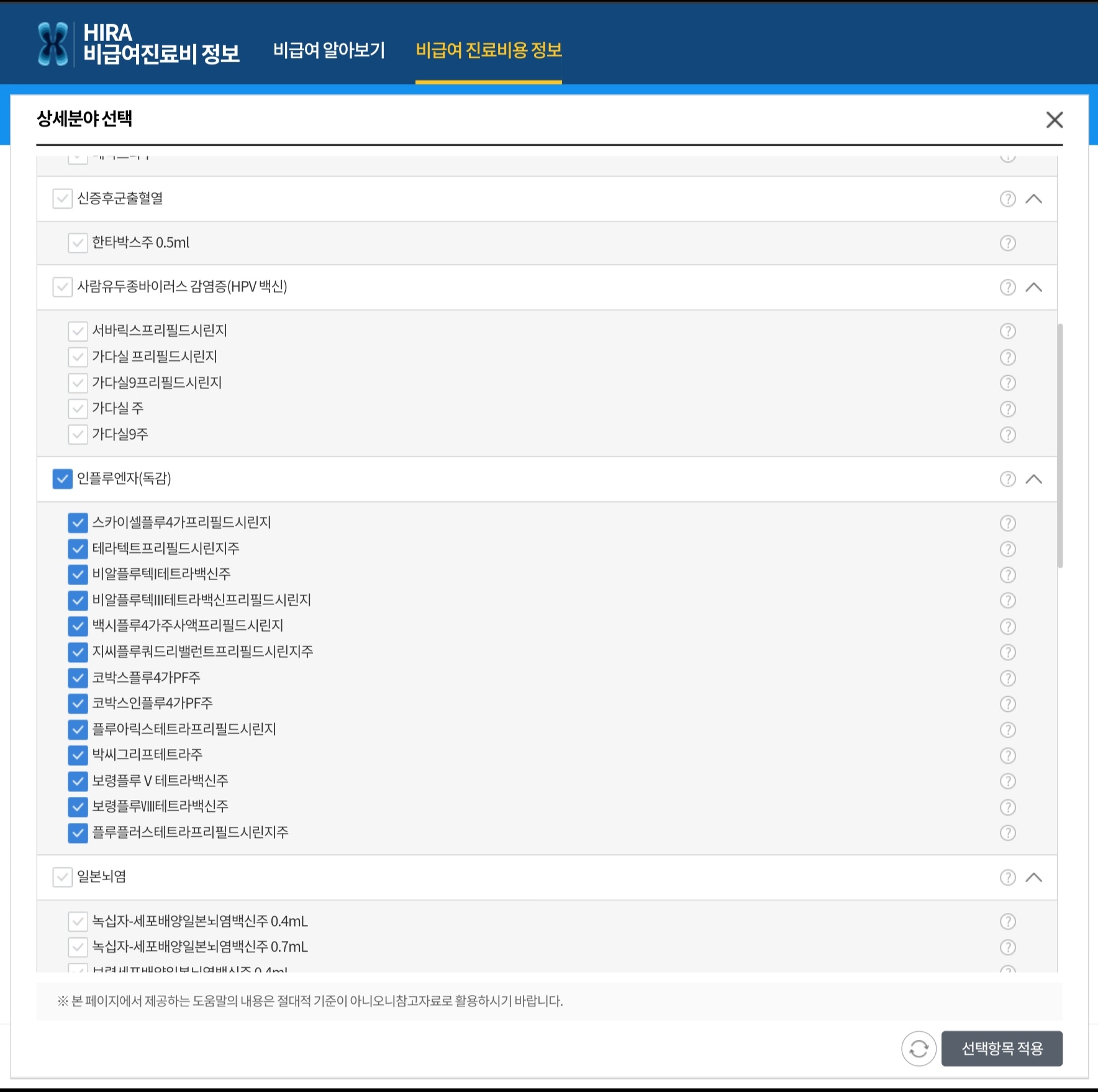 팝업 페이지에서 독감예방백신에 해당하는 인플루엔자(독감)에 체크하신 후 우측 하단의 선택항목 적용 버튼을 선택합니다.
