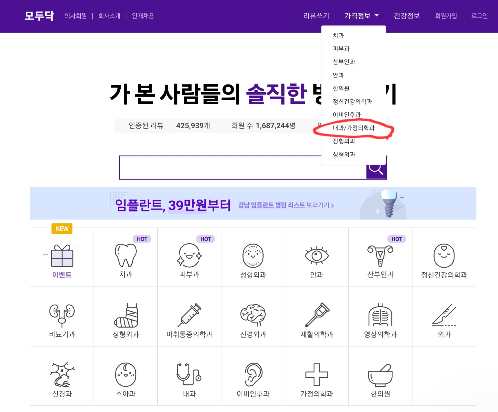 상단의 메뉴에서 "가격정보 > 내과/가정의학과"를 선택합니다.