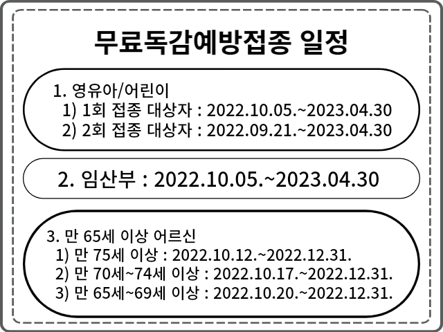 어르신의 경우 만 나이에 따라 무료독감예방접종의 시기가 다르니 접종 시기를 꼭 확인해주시기 바라며 영유아/어린이, 임산부 무료독감예방접종의 시기와 다르게 올해 말('22.12.31)까지가 무료독감예방접종 시기이니 꼭 기한 안에 접종을 받으시기 바랍니다.
