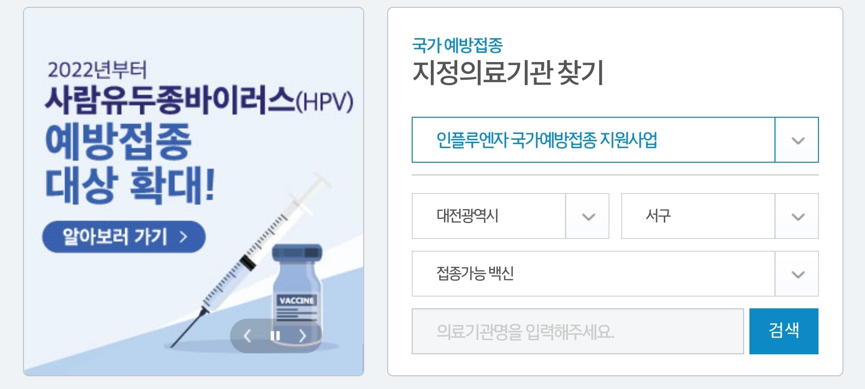 국가예방접종 지정의료기관 찾기에서 "인플루엔자 국가예방접종 지원사업"을 선택하시고 현재 거주하고 계시는 주거지에 대한 정보를 입력하고 검색버튼을 누릅니다.