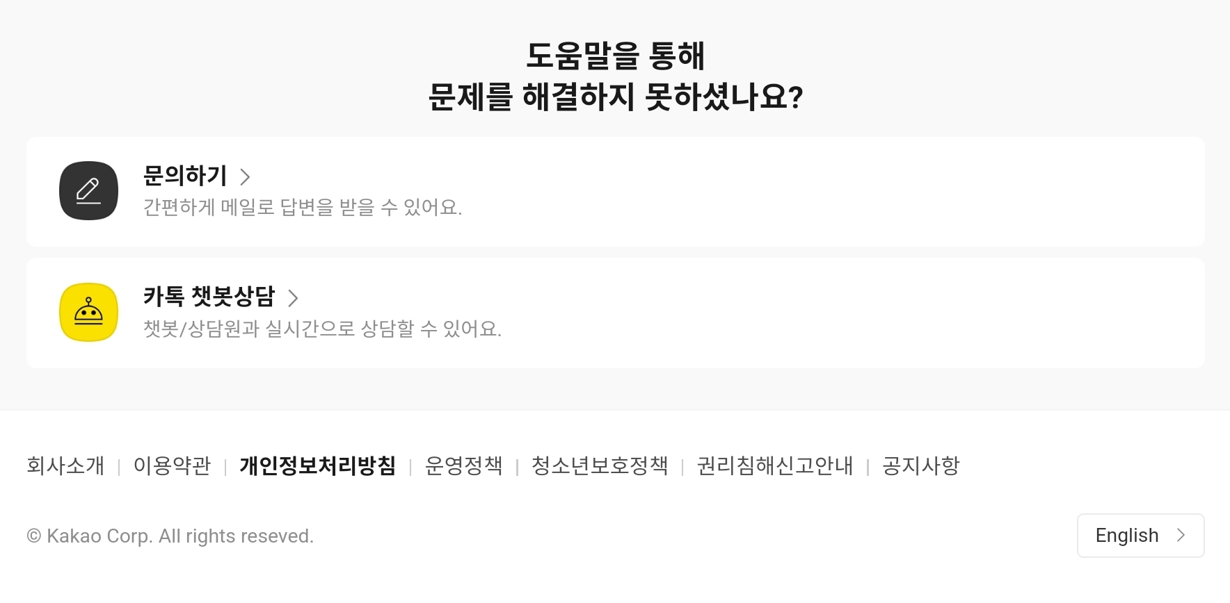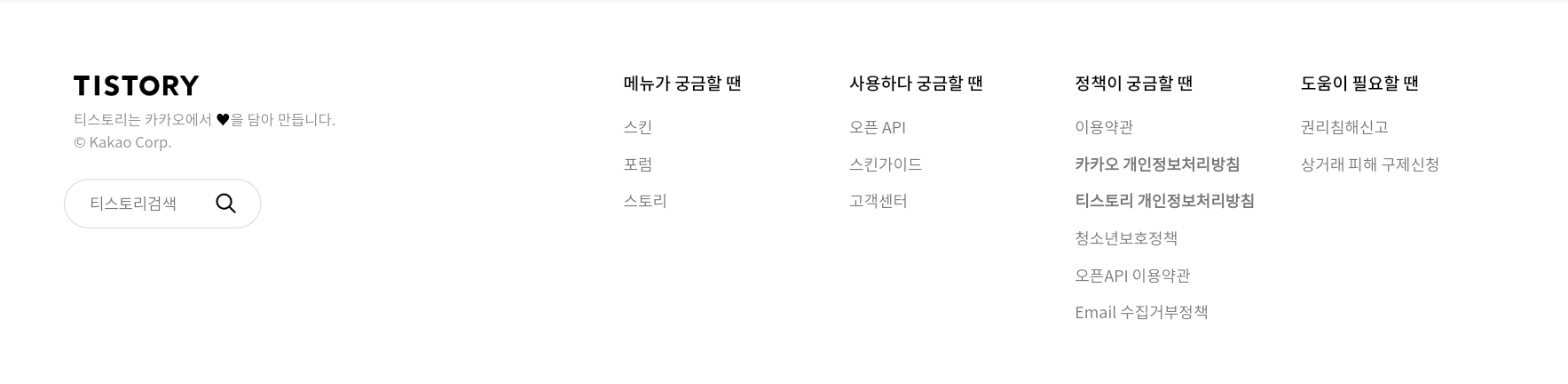 웹으로 접속한 티스토리 홈페이지 하단의 고객센터를 이용하는 방법인데요. 메일로 이의제기 하는 방법과 챗봇을 이용한 이의 제기 방법입니다.