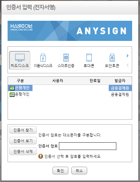 공동인증서 조회 버튼을 클릭하면 기존의 공동인증서를 선택하고 이용할 수 있는데요. 본인의 인증서를 클릭하고 암호를 입력한 후 확인 버튼을 누릅니다.