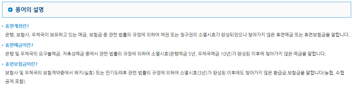휴면계좌 통합조회 시스템에 접속하면 여러가지 설명을 확인 할 수 있는데요. 휴면계좌 통합조회 시스템에서 사용하는 용어 설명, 휴면계좌 통합조회 방법, 휴면계좌 정보 조회 기간, 휴면계좌의 실제 수령 방법, 등을 알아볼 수 있으니 참고하시기 바랍니다.