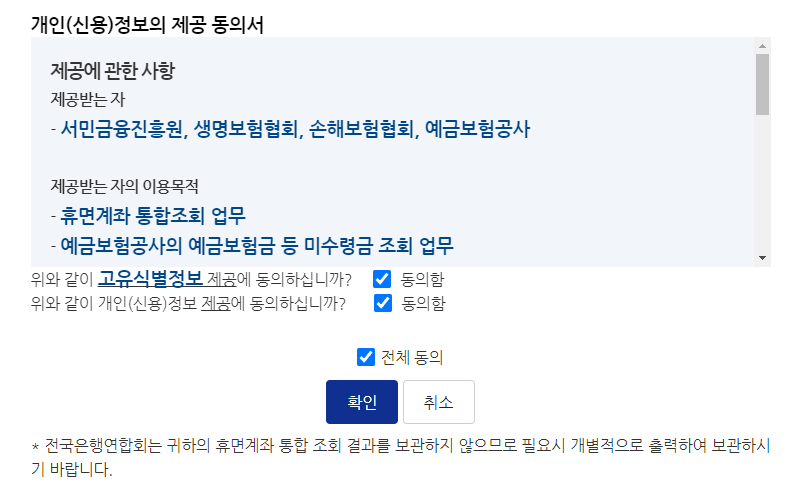 휴면계좌 통합정보 시스템을 사용하기 위해서는 개인 정보에 대한 동의가 필요하기 때문에 개인 정보의 이용에 관한 사항들을 읽어보시고 동의를 해주신 다음에 "확인" 버튼을 클릭합니다.